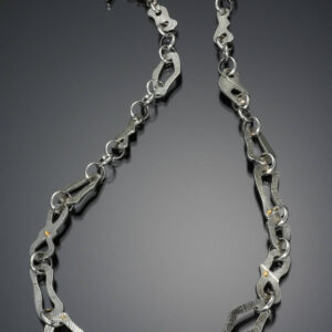 A very unique link necklace. Each abstract link is individually designed and sawed out by hand by Pauline. The links are textured sterling silver with 18K yellow gold accents. Comfortable to wear and very distinctive. A classic and versatile piece which will enhance casual or dress wear.